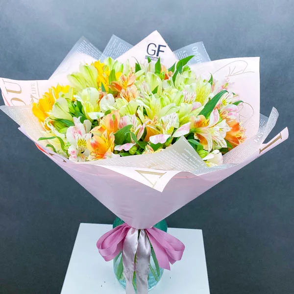 Букет состоит из альстромерии, которую еще называют перуанской лилией из-за внешнего сходства, разнообразное цветовое сочетание, в окружении декоративной зелени. Диаметр букета от 25см до 50см, в зависимости от выбранного варианты букета. Букет перевязан изящным розовым бантом. Обращаем Ваше внимание, что состав и оформление букета может отличаться.